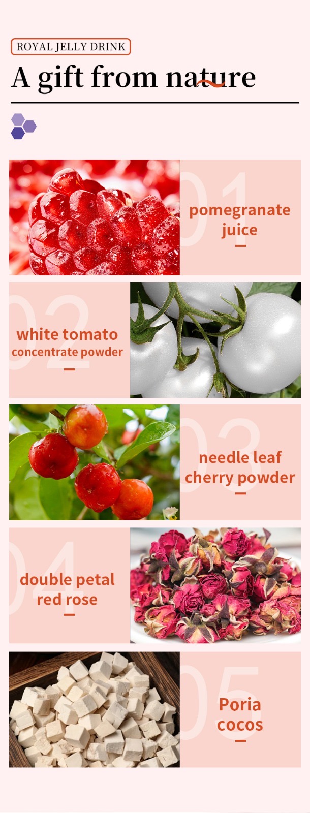 • Royal Jelly นมผึ้ง ช่วยเติมเต็มสารอาหารที่ผิวต้องการ ให้ผิวดูชุ่มชื้น เปล่งปลั่ง