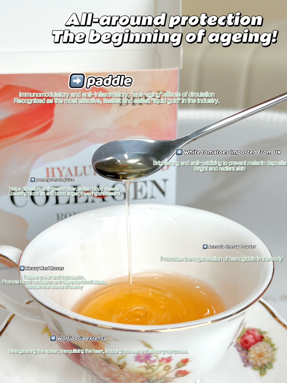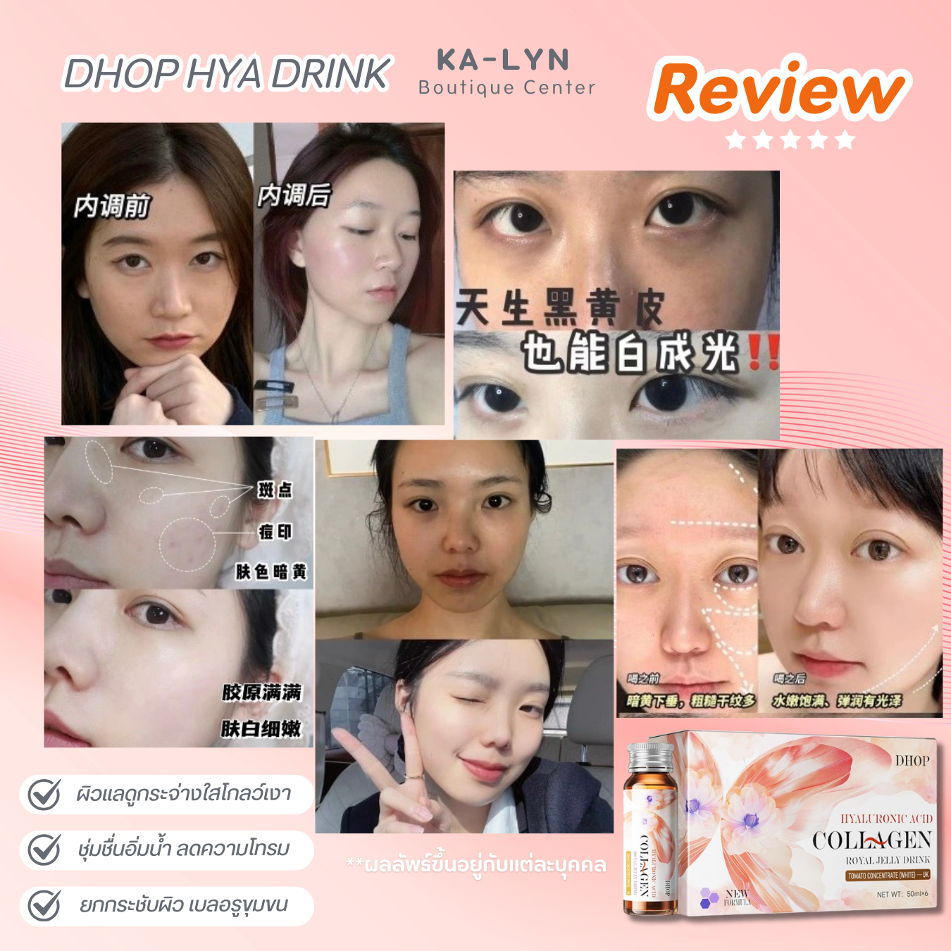 • สูตร ผสานพลัง Collagen + Hyaluronic Acid + Royal Jelly ที่ช่วยดูแลผิวจากภายใน